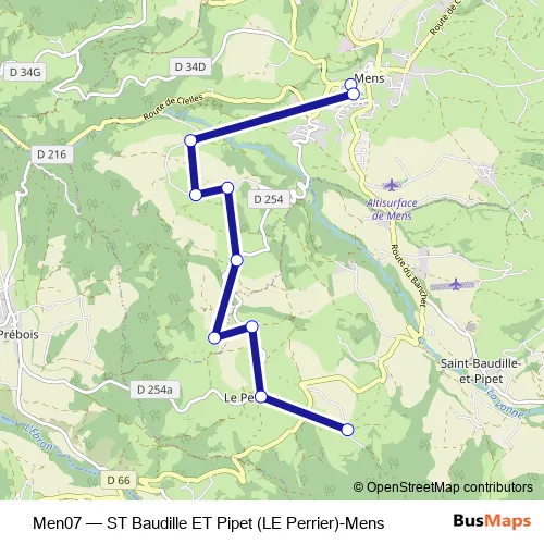 The first stop of the Men07 bus route is Ecoles and the last stop is La Chapelle du Cros. Men07 (ST Baudille ET Pipet (LE Perrier)-Mens) is operational during entre semana.