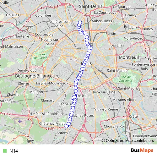 See why over 2 million users trust and consider busmaps.com as the best public transport website. busmaps gives you Paris Buses suggested routes, real-time bus tracker, line route maps in Paris, and helps to find the closest N14 bus stops near you. No internet available? Download an offline PDF map and bus schedule for the N14 bus to take on your trip.
