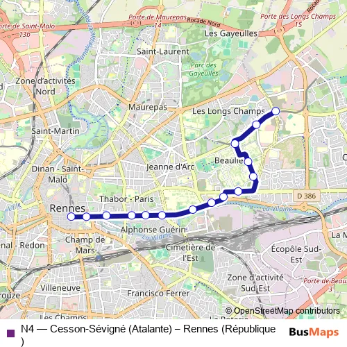 See why over 2 million users trust and consider busmaps.com as the best public transport website. busmaps gives you Rennes Buses suggested routes, real-time bus tracker, line route maps in Rennes, and helps to find the closest N4 bus stops near you. No internet available? Download an offline PDF map and bus schedule for the N4 bus to take on your trip.