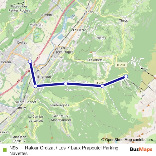 The first stop of the N95 bus route is Les Adrets, Prapoutel Parking navette and the last stop is Crolles, Rafour Croizat. N95 (Rafour Croizat / Les 7 Laux Prapoutel Parking Navettes) is operational during todos los días.