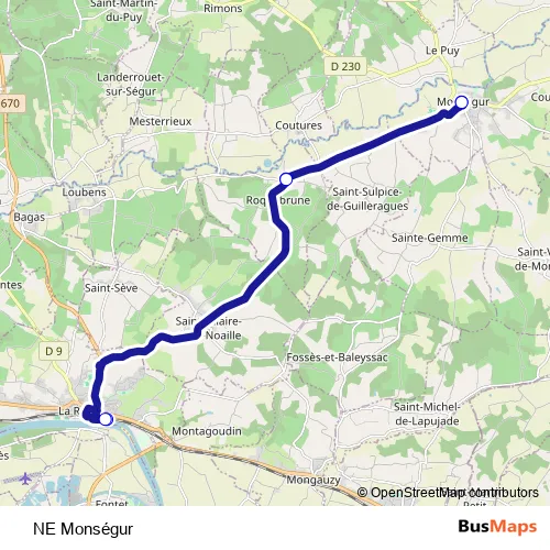 Additional information: NE Monségur has 6 stops and the total trip duration for this route is approximately 60 minutes.