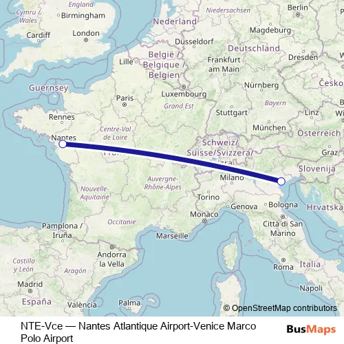 The first stop of the NTE-Vce bus route is Aéroport de Venise and the last stop is Aéroport Nantes Atlantique. NTE-Vce (Nantes Atlantique Airport-Venice Marco Polo Airport) is operational during todos los días.