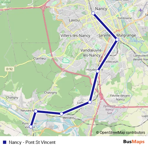 See why over 2 million users trust and consider busmaps.com as the best public transport website. busmaps gives you Nancy Buses suggested routes, real-time bus tracker, line route maps in Nancy, and helps to find the closest Nancy - Pont St Vincent bus stops near you. No internet available? Download an offline PDF map and bus schedule for the Nancy - Pont St Vincent bus to take on your trip.