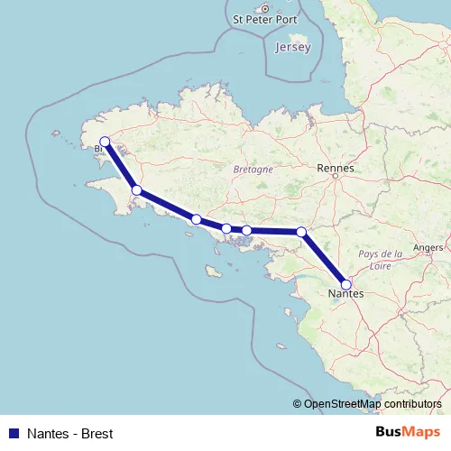 The first stop of the Nantes - Brest rail route is Gare de Nantes and the last stop is Gare de Quimper. Nantes - Brest (Nantes - Brest) is operational during todos los días.