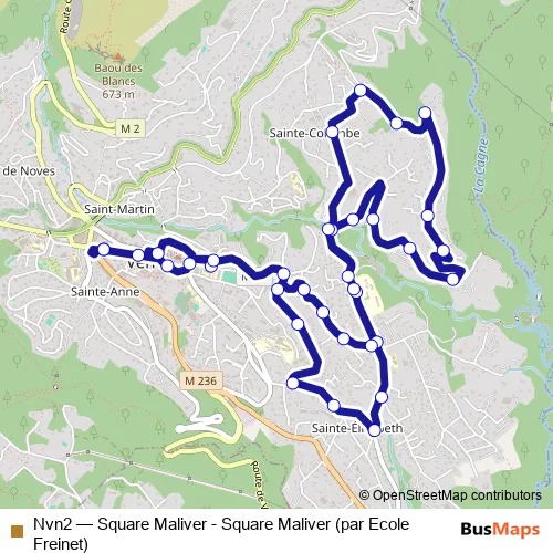 The first stop of the Nvn2 bus route is Square Maliver and the last stop is Square Maliver. Nvn2 (Square Maliver - Square Maliver (par Ecole Freinet)) is operational during todos los días.