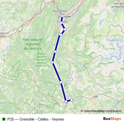 The first stop of the P25 rail route is Clelles - Mens and the last stop is Grenoble. P25 (Grenoble - Clelles - Veynes) is operational during todos los días.