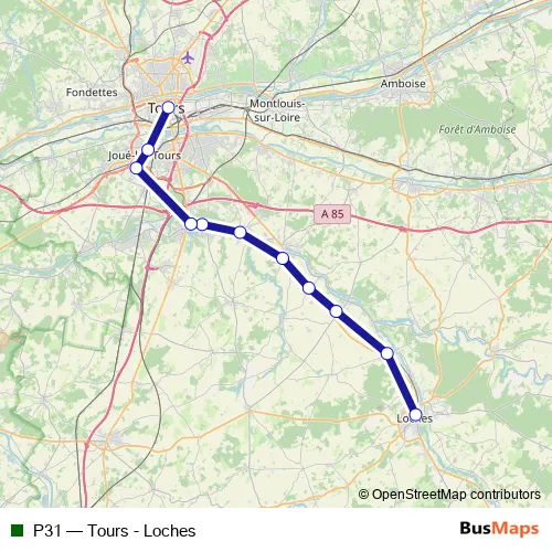 The first stop of the P31 rail route is Loches and the last stop is Tours. P31 (Tours - Loches) is operational during todos los días.