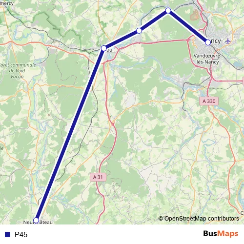 The first stop of the P45 rail route is Neufchâteau and the last stop is Nancy. P45 is operational during todos los días.