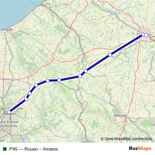 The first stop of the P45 rail route is Rouen Rive Droite and the last stop is Amiens. P45 (Rouen – Amiens) is operational during todos los días.