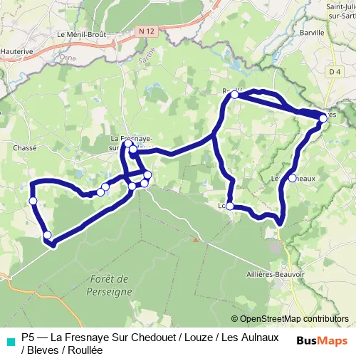 Click here to view the nearest P5 - La Fresnaye Sur Chedouet / Louze / Les Aulnaux / Bleves / Roullée bus stop.
