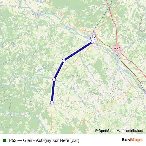 The first stop of the P53 bus route is Aubigny-sur-Nère and the last stop is Gien. P53 (Gien - Aubigny sur Nère (car)) is operational during todos los días.