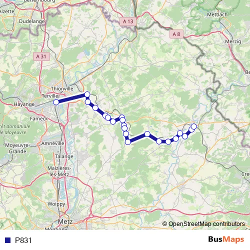 The first stop of the P831 bus route is Thionville and the last stop is Bouzonville. P831 is operational during entre semana.