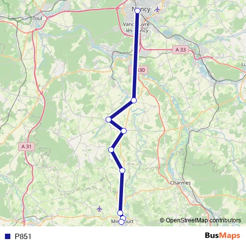 The first stop of the P851 bus route is Nancy and the last stop is Mirecourt. P851 is operational during todos los días.