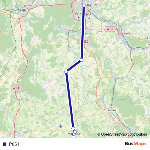 The first stop of the P851 bus route is Mirecourt Lycée Agricole and the last stop is Nancy. P851 is operational during todos los días.