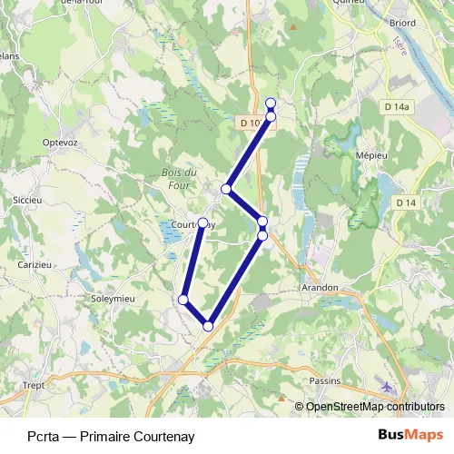 The first stop of the Pcrta bus route is Poleyrieu Village and the last stop is Ecole. Pcrta (Primaire Courtenay) is operational during todos los días.