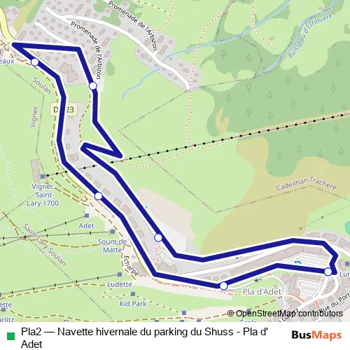 The first stop of the Pla2 bus route is PLA D'Adet - Téléphérique and the last stop is PLA D'Adet - Téléphérique. Pla2 (Navette hivernale du parking du Shuss - Pla d'Adet) is operational during los fines de semana.