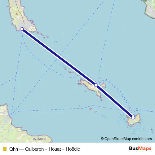 The first stop of the Qhh ferry route is Hoëdic and the last stop is Quiberon. Qhh (Quiberon – Houat – Hoëdic) is operational during todos los días.