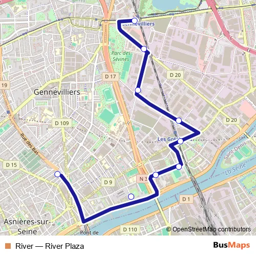 The first stop of the River bus route is Gabriel Péri - Métro and the last stop is Gare de Gennevilliers. River (River Plaza) is operational during entre semana.