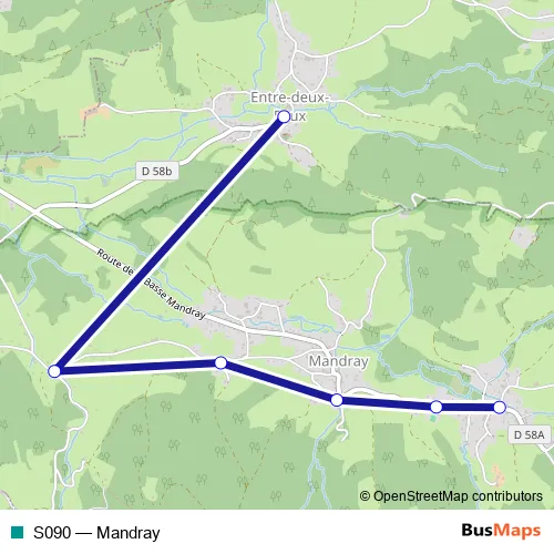 The first stop of the S090 bus route is Entre Deux Eaux Mairie and the last stop is Mandray Ecole Maternelle. S090 (Mandray) is operational during todos los días.