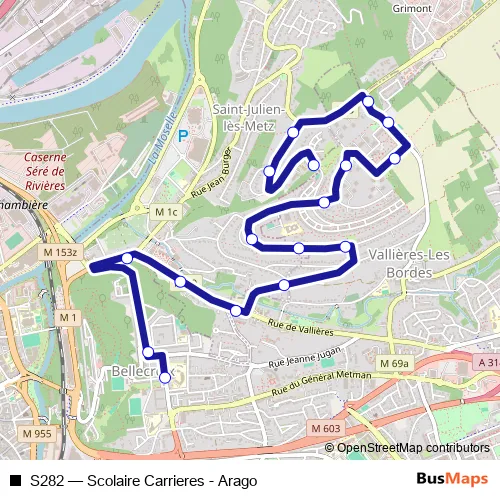 See why over 2 million users trust and consider busmaps.com as the best public transport website. busmaps gives you Metz Buses suggested routes, real-time bus tracker, line route maps in Metz, and helps to find the closest S282 bus stops near you. No internet available? Download an offline PDF map and bus schedule for the S282 bus to take on your trip.