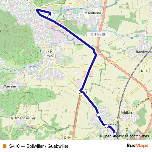 The first stop of the S410 bus route is Guebwiller - College and the last stop is Bollwiller - Gendarmerie. S410 (Bollwiller / Guebwiller) is operational during entre semana.