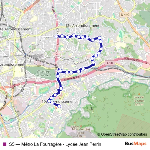 The first stop of the S5 bus route is Lycée Jean Perrin and the last stop is Métro La Fourragère. S5 (Métro La Fourragère - Lycée Jean Perrin) is operational during entre semana.