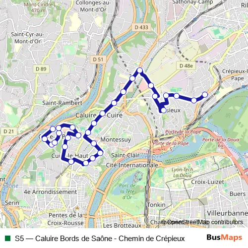 Click here to view the nearest S5 - Caluire Bords de Saône - Chemin de Crépieux bus stop.