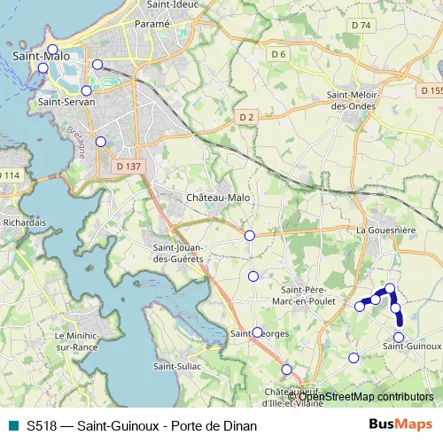 See why over 2 million users trust and consider busmaps.com as the best public transport website. busmaps gives you Saint-Malo Buses suggested routes, real-time bus tracker, line route maps in Saint-Malo, and helps to find the closest S518 bus stops near you. No internet available? Download an offline PDF map and bus schedule for the S518 bus to take on your trip.