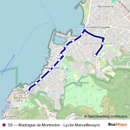 Click here to view the nearest S8 - Madrague de Montredon - Lycée Marseilleveyre bus stop.