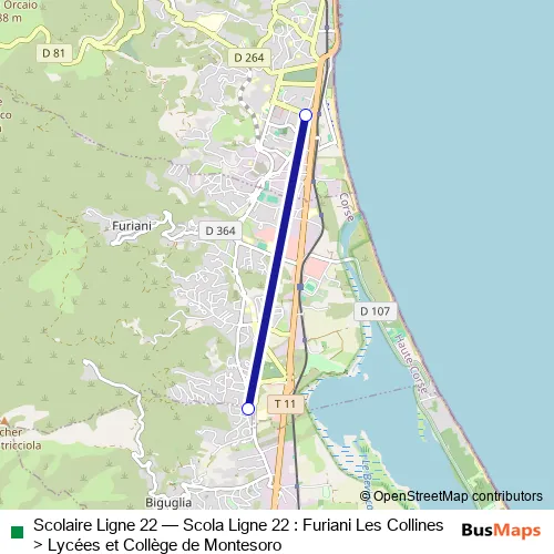 The first stop of the Scolaire Ligne 22 bus route is Liceu di Montesoru and the last stop is Guadone (U). Scolaire Ligne 22 (Scola Ligne 22 : Furiani Les Collines > Lycées et Collège de Montesoro) is operational during entre semana.