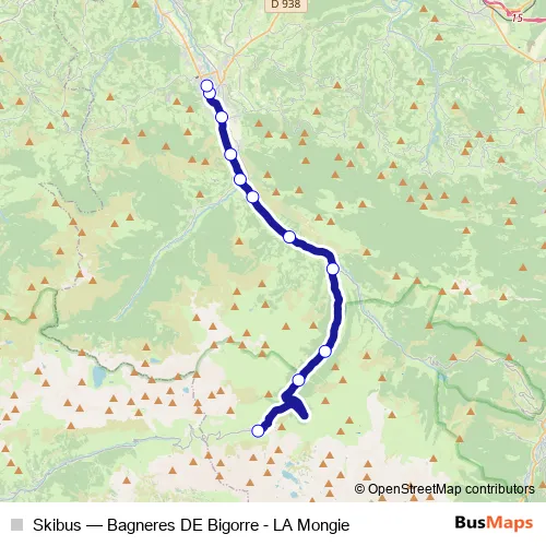 The first stop of the Skibus bus route is LA Mongie - La Mongie and the last stop is Bagnères-DE-Bigorre - Ancienne Gare Sncf. Skibus (Bagneres DE Bigorre - LA Mongie) is operational during todos los días.