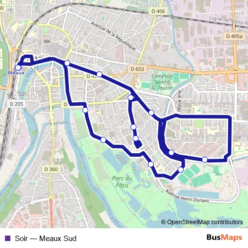 The first stop of the Soir bus route is Gare de Meaux (Quai 4) and the last stop is Gare de Meaux (Dépose). Soir (Meaux Sud) is operational during todos los días.