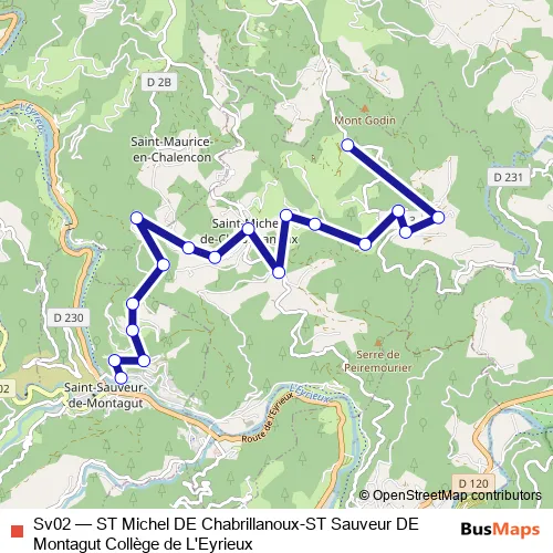 The first stop of the Sv02 bus route is ST Sauveur DE Montagut Collège de L'Eyrieux and the last stop is ST Michel DE Chabrillanoux Les Buissons. Sv02 (ST Michel DE Chabrillanoux-ST Sauveur DE Montagut Collège de L'Eyrieux) is operational during entre semana.
