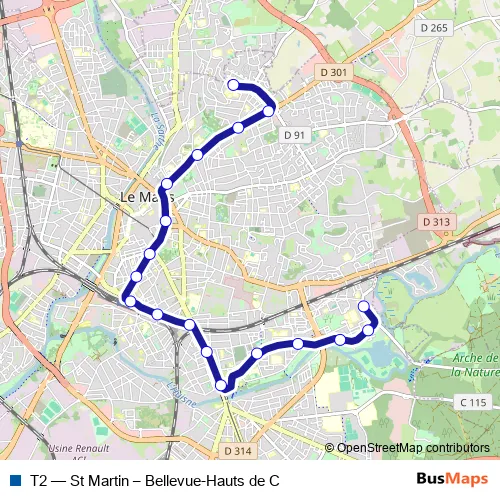Tram T2 - St Martin – Bellevue-Hauts de C in Le Mans: Stops & Timetable