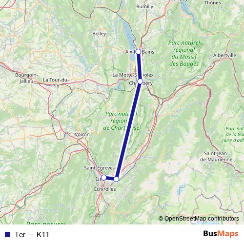 The first stop of the Ter rail route is Aix-les-Bains-le-Revard and the last stop is Grenoble. Ter (K11) is operational during todos los días.