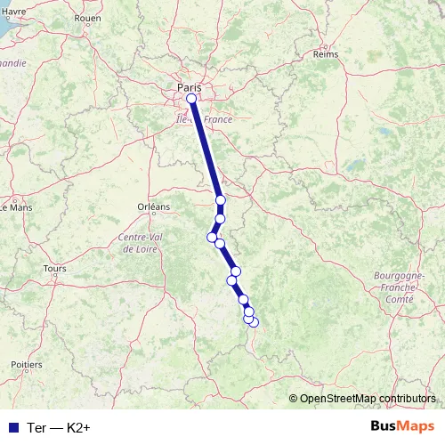 The first stop of the Ter rail route is Nevers and the last stop is Paris-Bercy. Ter (K2+) is operational during todos los días.