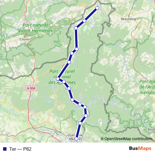 The first stop of the Ter rail route is Givet and the last stop is Charleville-Mézières. Ter (P62) is operational during todos los días.