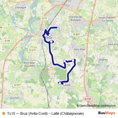 The first stop of the Ts10 bus route is Anita Conti and the last stop is Châtaigneraie. Ts10 (Bruz (Anita Conti) – Laillé (Châtaigneraie)) is operational during entre semana.