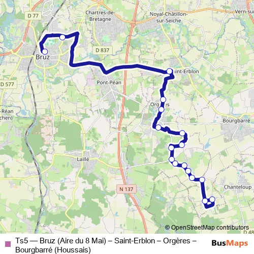 Click here to view the nearest Ts5 - Bruz (Aire du 8 Mai) – Saint-Erblon – Orgères – Bourgbarré (Houssais) bus stop.