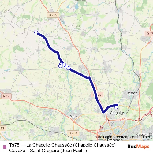 The first stop of the Ts75 bus route is Jean-Paul Ii and the last stop is Chapelle-Chaussée. Ts75 (La Chapelle-Chaussée (Chapelle-Chaussée) – Gevezé – Saint-Grégoire (Jean-Paul Ii)) is operational during entre semana.