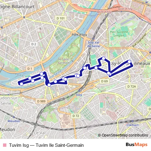 The first stop of the Tuvim Isg bus route is Mairie d'Issy and the last stop is Mairie d'Issy. Tuvim Isg (Tuvim Ile Saint-Germain) is operational during todos los días.