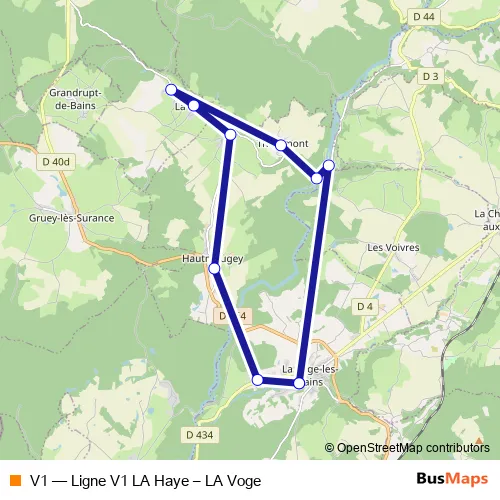 The first stop of the V1 bus route is LA Voge-LES-Bains - Ecole Primaire and the last stop is LA Voge-LES-Bains - Ecole Primaire. V1 (Ligne V1 LA Haye – LA Voge) is operational during entre semana.