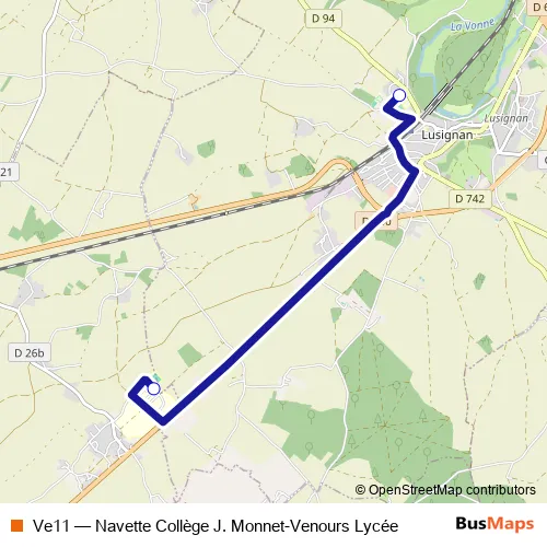 The first stop of the Ve11 bus route is Lycée de Venours and the last stop is Collège J. Monnet. Ve11 (Navette Collège J. Monnet-Venours Lycée) is operational during entre semana.