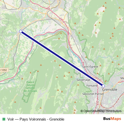 The first stop of the Voir bus route is Tullins, Tullins - Av. de la Gare and the last stop is Grenoble, Grenoble - Porte de France. Voir (Pays Voironnais - Grenoble) is operational during entre semana.