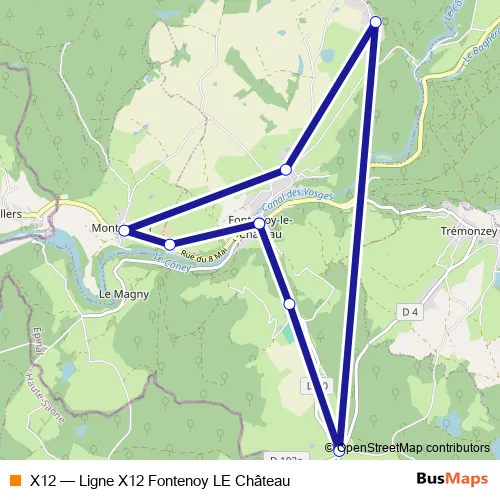 See why over 2 million users trust and consider busmaps.com as the best public transport website. busmaps gives you Fontenoy-le-Chateau Buses suggested routes, real-time bus tracker, line route maps in Fontenoy-le-Chateau, and helps to find the closest X12 bus stops near you. No internet available? Download an offline PDF map and bus schedule for the X12 bus to take on your trip.