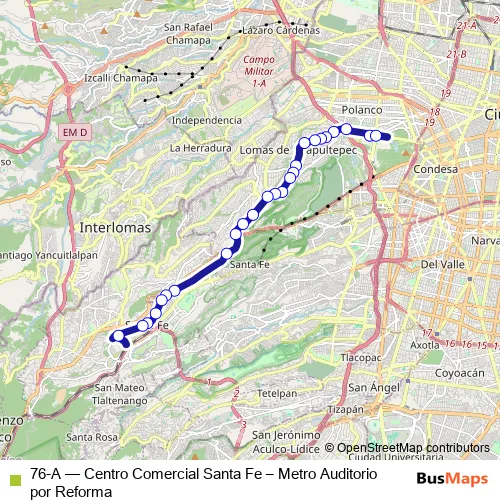 The first stop of the 76-A bus route is C. B. Auditorio Nacional-Paseo de la Reforma and the last stop is C. C. Centro Comercial Santa Fe - Av. Vasco de Quiroga y Juan Salvador Agraz. 76-A (Centro Comercial Santa Fe – Metro Auditorio por Reforma) is operational during todos los días.