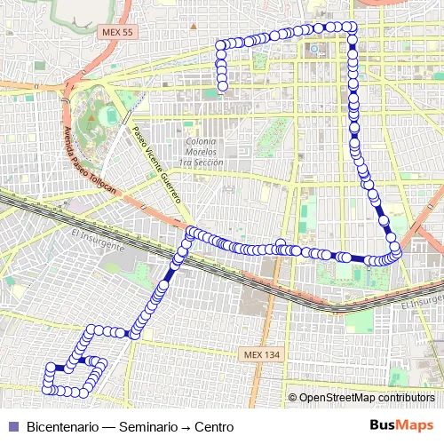 The first stop of the Bicentenario bus route is Calle General Miguel Blanco y Calle Ligeros de Toluca and the last stop is Avenida José María Morelos y Pavón y Calle Felipe Villanueva. Bicentenario (Seminario → Centro) is operational during todos los días.