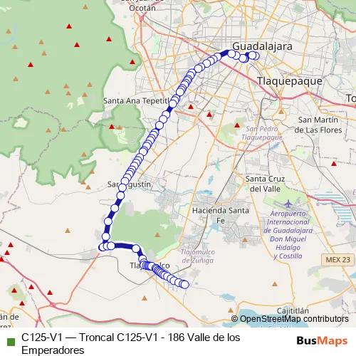 See why over 2 million users trust and consider busmaps.com as the best public transport website. busmaps gives you Tlajomulco de Zuniga Buses suggested routes, real-time bus tracker, line route maps in Tlajomulco de Zuniga, and helps to find the closest C125-V1 bus stops near you. No internet available? Download an offline PDF map and bus schedule for the C125-V1 bus to take on your trip.