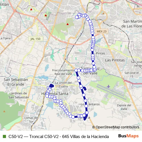 See why over 2 million users trust and consider busmaps.com as the best public transport website. busmaps gives you Guadalajara Buses suggested routes, real-time bus tracker, line route maps in Guadalajara, and helps to find the closest C50-V2 bus stops near you. No internet available? Download an offline PDF map and bus schedule for the C50-V2 bus to take on your trip.