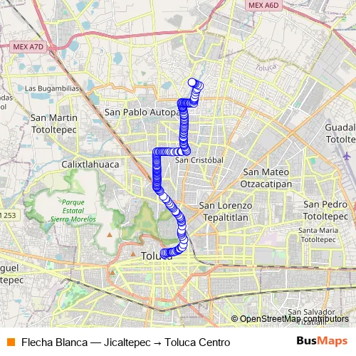 The first stop of the Flecha Blanca bus route is Calle Ignacio López Rayón and the last stop is Avenida Toluca. Flecha Blanca (Jicaltepec → Toluca Centro) is operational during todos los días.